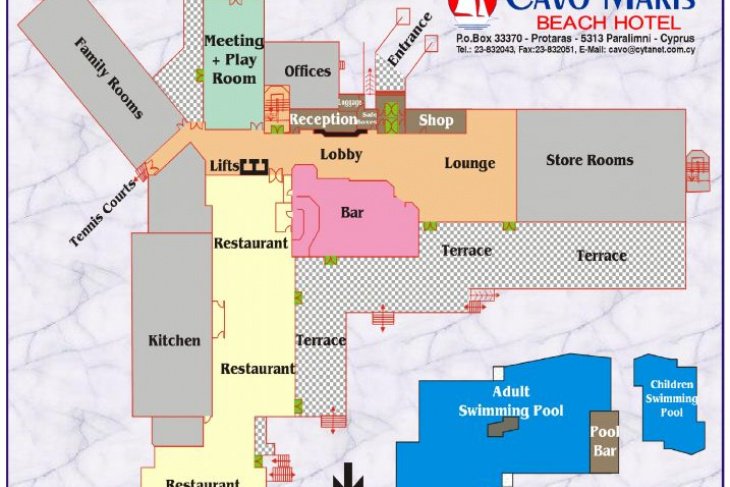 няня ($) по запросуСервис в отеле интернет WiFi конференц-зал почта факс Услуги в отеле заказ билетов кам.хран. лобби обмен валют прачечная сейф Развлечения и спорт анимация вечером дартс дискотека живая музыка игровой зал развлекательные программы экскурсионные программы ($) электронные игры Спорт бильярд волейбол пляжный теннис настольный теннисные корты : 2 Красота и здоровье доктор ($) по вызову Пляж песчаный пляж собственный Услуги на пляже бар на пляже : Neptune Beach Kiosk зонтики лежаки Контакты Отель: Cavo Maris Beach 3*