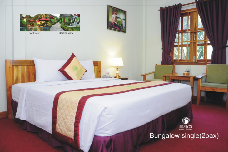 - Bungalow Garden View – Triple (35 м2) – спальня, ванная, терраса с видом на сад.